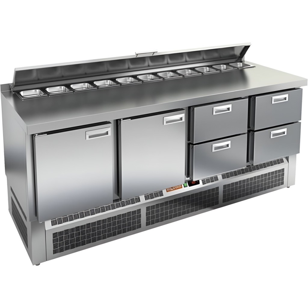 Стол холодильный для салатов HiCold SLE2-1122GN (1/6) с крышкой — это профессиональный салатный стол, предназначенный для использования в кафе, ресторанах, пиццериях и других предприятиях общественного питания. Он совмещает в себе просторную рабочую поверхность и охлаждаемый объем, обеспечивая удобство и эффективность при приготовлении различных блюд — от салатов до пиццы.