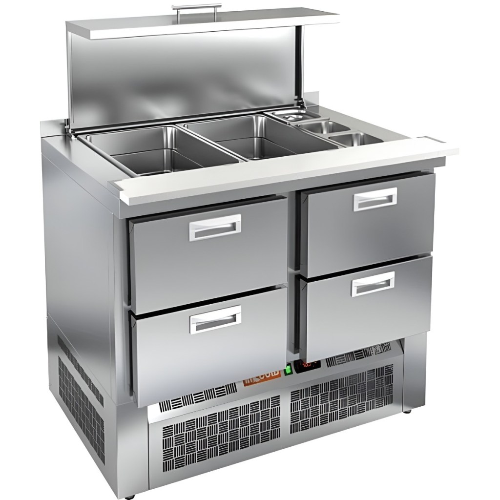 Модель обеспечивает удобный доступ к продуктам и позволяет повару работать максимально эффективно. Корпус изготовлен из нержавеющей стали, а столешница выполнена из прочного полипропилена, что делает конструкцию гигиеничной, устойчивой к влаге и удобной для ежедневной эксплуатации. Металлическая крышка защищает продукты от загрязнений и сохраняет их свежесть.