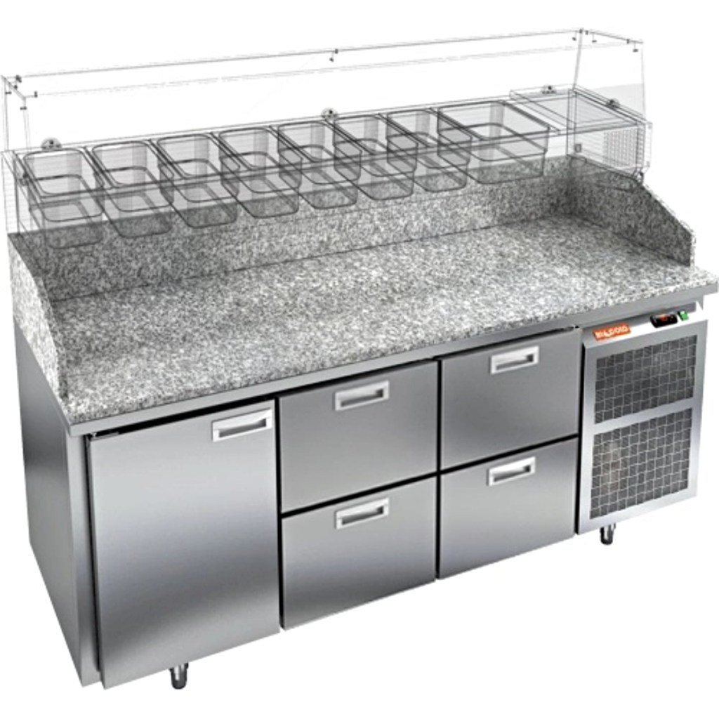 Каталог оборудования Холодильное оборудованиеСтолы охлаждаемыеСтолы холодильные для пиццыСтол холодильный для пиццы HiCold PZ3-122/GN камень Стол холодильный для пиццы HiCold PZ3-122/GN камень Код товара: 065-008 Поделиться: WhatsAppTelegram СравнитьДобавить в КПВ избранное 0 327 952 ₽ В корзину 0 шт Под заказСамовывоз сегодня бесплатно Взять в кредит Купить в лизинг Получить консультацию в WhatsApp Описание Характеристики Отзывы 0 Стол холодильный для пиццы HiCold PZE3-122/GN камень предназначен для использования в пиццериях, кафе, магазинах и ресторанах. Он идеально подходит для раскатки теста, подготовки ингредиентов и кратковременного хранения скоропортящихся продуктов. Витрина приобретается отдельно. Стол сочетает корпус из нержавеющей стали и гранитную столешницу, которая устойчива к механическим и температурным нагрузкам и удобна в работе с тестом. Такая конструкция обеспечивает долговечность, гигиеничность и простоту ухода. Особенности модели: Охлаждение: динамическое — равномерное поддержание температуры Оттайка: автоматическая — удобство и экономия времени Панель управления: электронная — точная настройка температуры Ножки: регулируемые по высоте — устойчивость на неровной поверхности Двери: 1 глухая дверца с автоматическими доводчиками и фиксатором открытого положения Ящики: 4 выдвижных ящика — удобное хранение ингредиентов Уплотнители: легкозаменяемые магнитные — герметичность и простота обслуживания Толщина теплоизоляции: 50 мм — сохранение холода и энергоэффективность Рабочая поверхность: глубина 680 мм — удобство работы HiCold PZE3-122/GN камень— это надёжный и функциональный холодильный стол для пиццы, который сочетает прочность, эргономику и эффективное охлаждение. Благодаря гранитной столешнице, корпусу из нержавеющей стали, двум глухим дверям и двум выдвижным ящикам он станет универсальным решением для профессиональной кухни. Изображение товара, представленного на фото, может отличаться от его фактического вида. Показать все Габаритные размеры1835×700×1050 ммДиапазон рабочей температурыот +2 до +10 °CРасположение агрегатаБоковое Материал столешницыГранитная Тип столаС дверьми и ящиками Тип двериГлухая Объём505 лКоличество дверей1 штКоличество ящиков4 штРазмер полки530×325 ммНапряжение220 ВМощность0,5 кВтТип охлажденияДинамическое Тип оттайкиАвтоматическая Габариты в упаковке2000×850×1180 ммВес нетто172 кгВес брутто192 кгБрендHicoldВсе холодильные столы для пиццы HicoldВсе нержавеющие холодильные столы для пиццы Оставить отзыв Еще никто не оставил отзыв на этот товар Ранее просмотрено Под заказ 297 352 ₽ Стол холодильный для пиццы HiCold PZ3-211/GN камень Под заказ 268 552 ₽ Стол холодильный для пиццы HiCold PZ3-13/GN камень Под заказ 207 801 ₽ Стол холодильный для пиццы HiCold PZE1-111GN (1/3) камень Под заказ 358 552 ₽ Стол холодильный для пиццы HiCold PZ3-133/GN камень