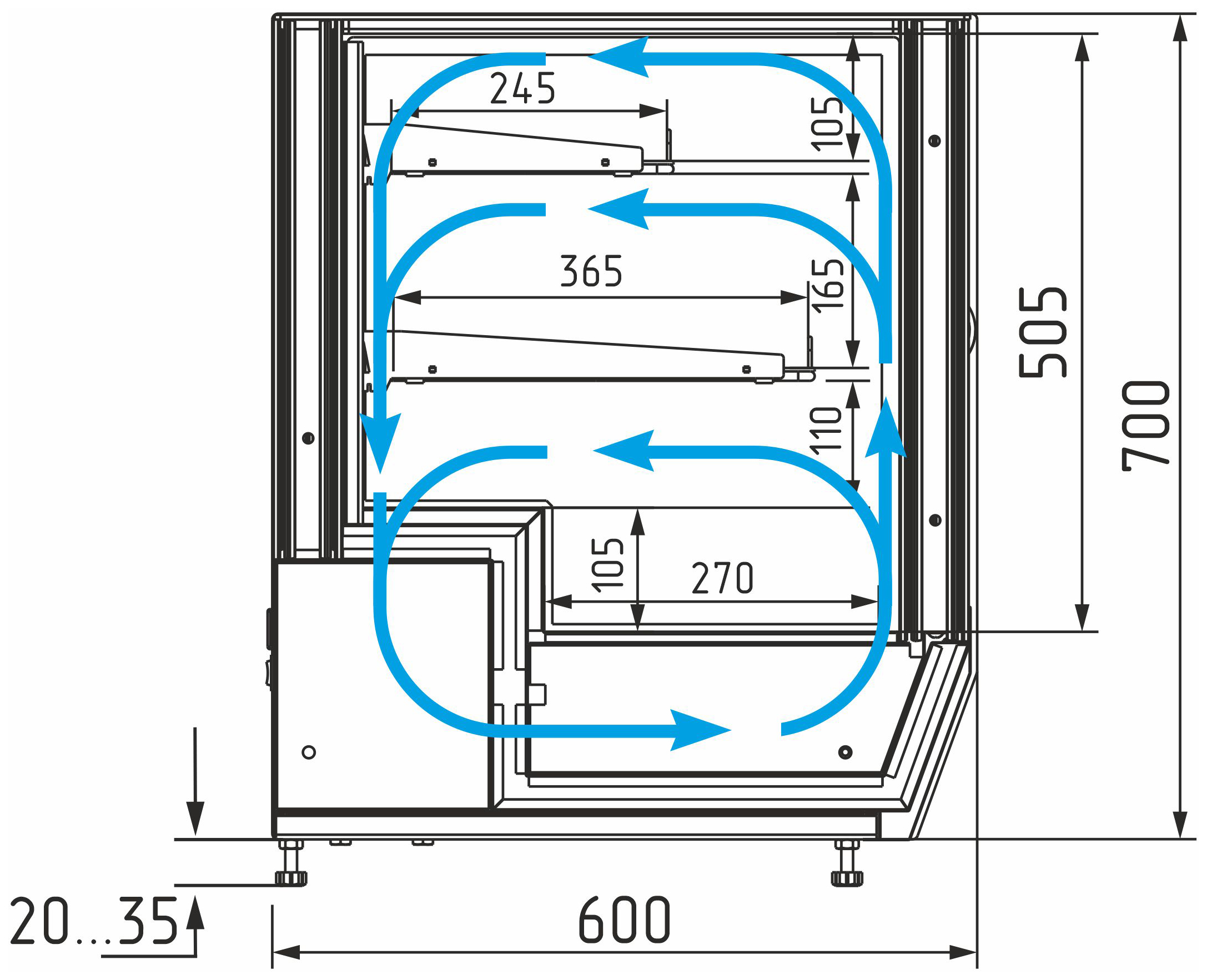 Максимальная высота выкладки продуктов: нижний поддон — 150 мм, полки — 100 мм